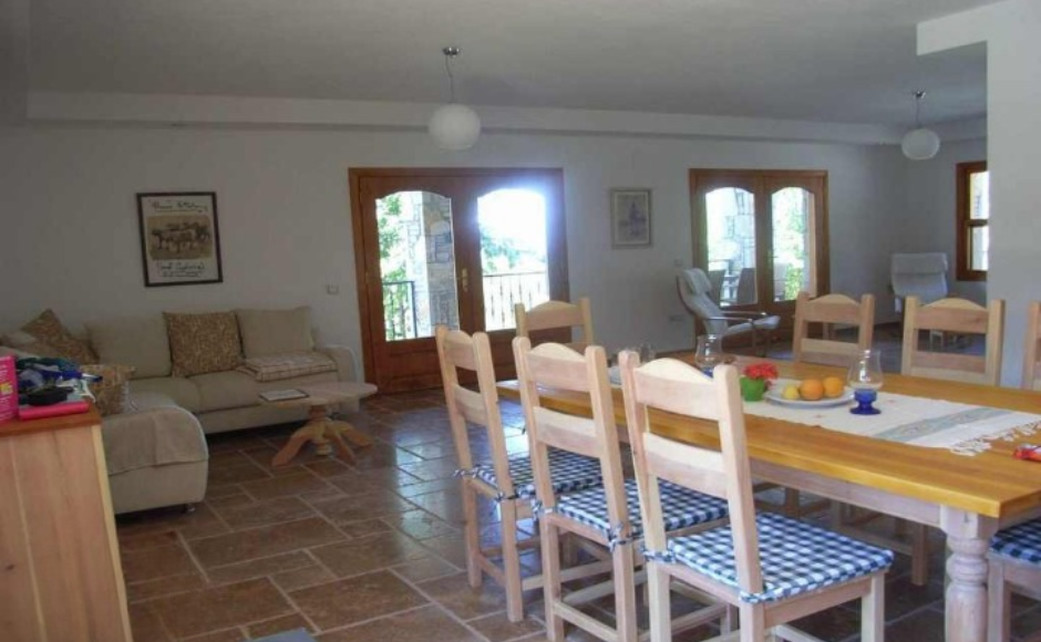 The lounge is fitted in relaxed style with armchairs and a bench sofa. There is a DVD player but no TV, and open fireplace. Three sets of French doors lead onto the garden terraces where there are plenty of further seating options so you can find your very own perfect spot on a shaded veranda which has stunning views of the delta, beach and mountains beyond.