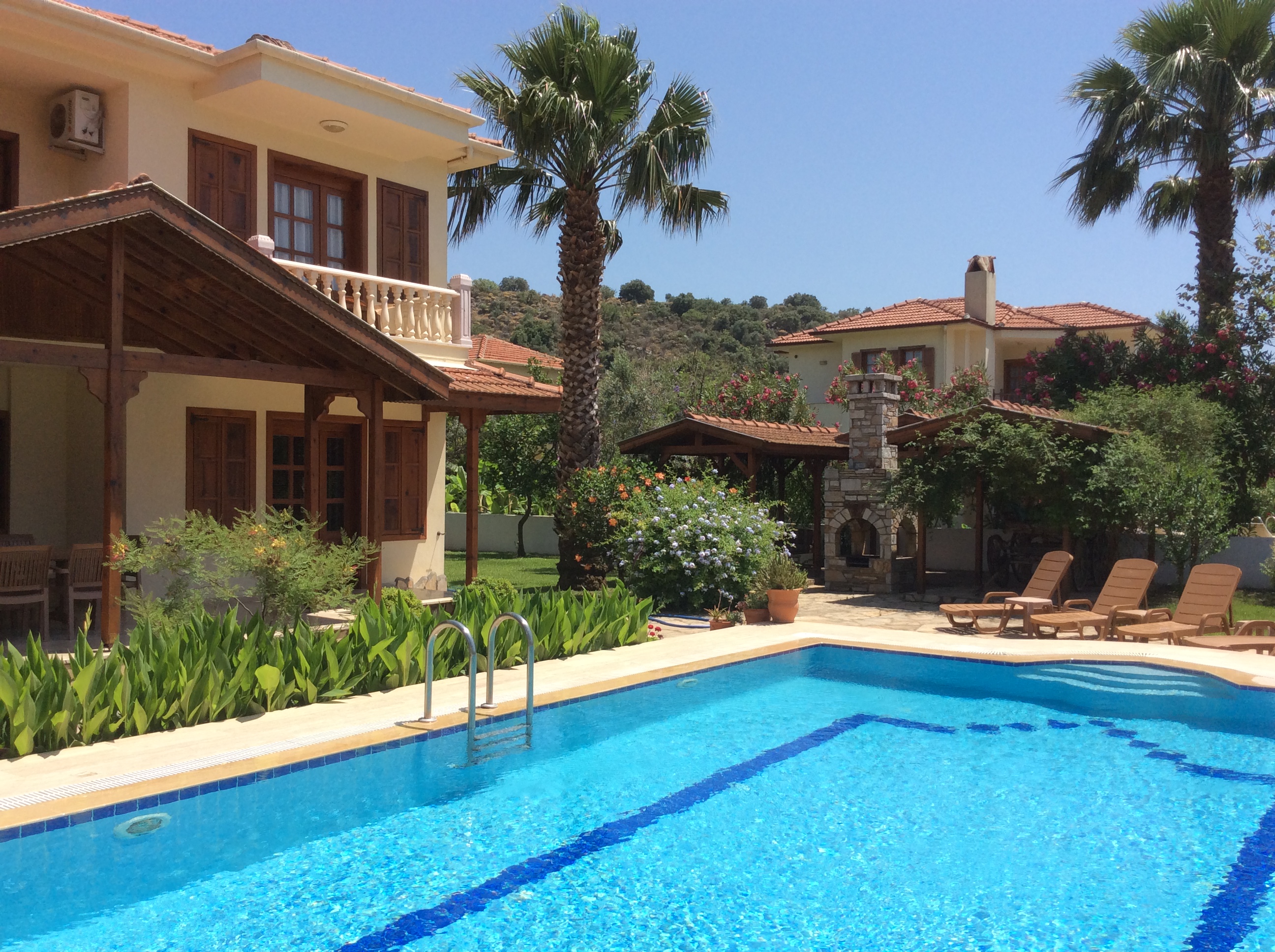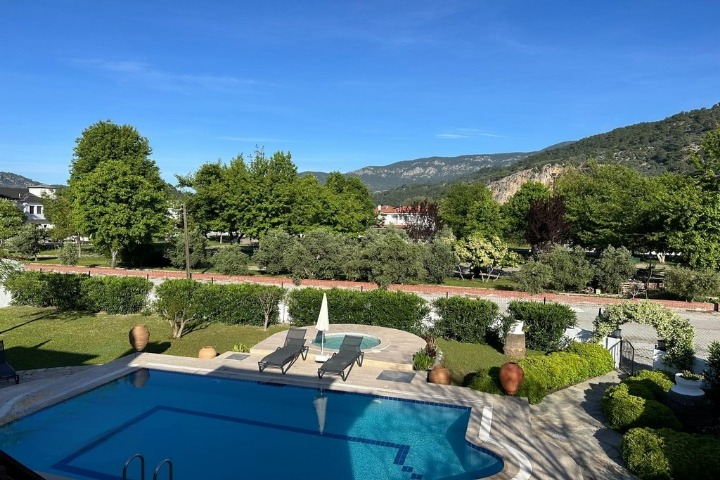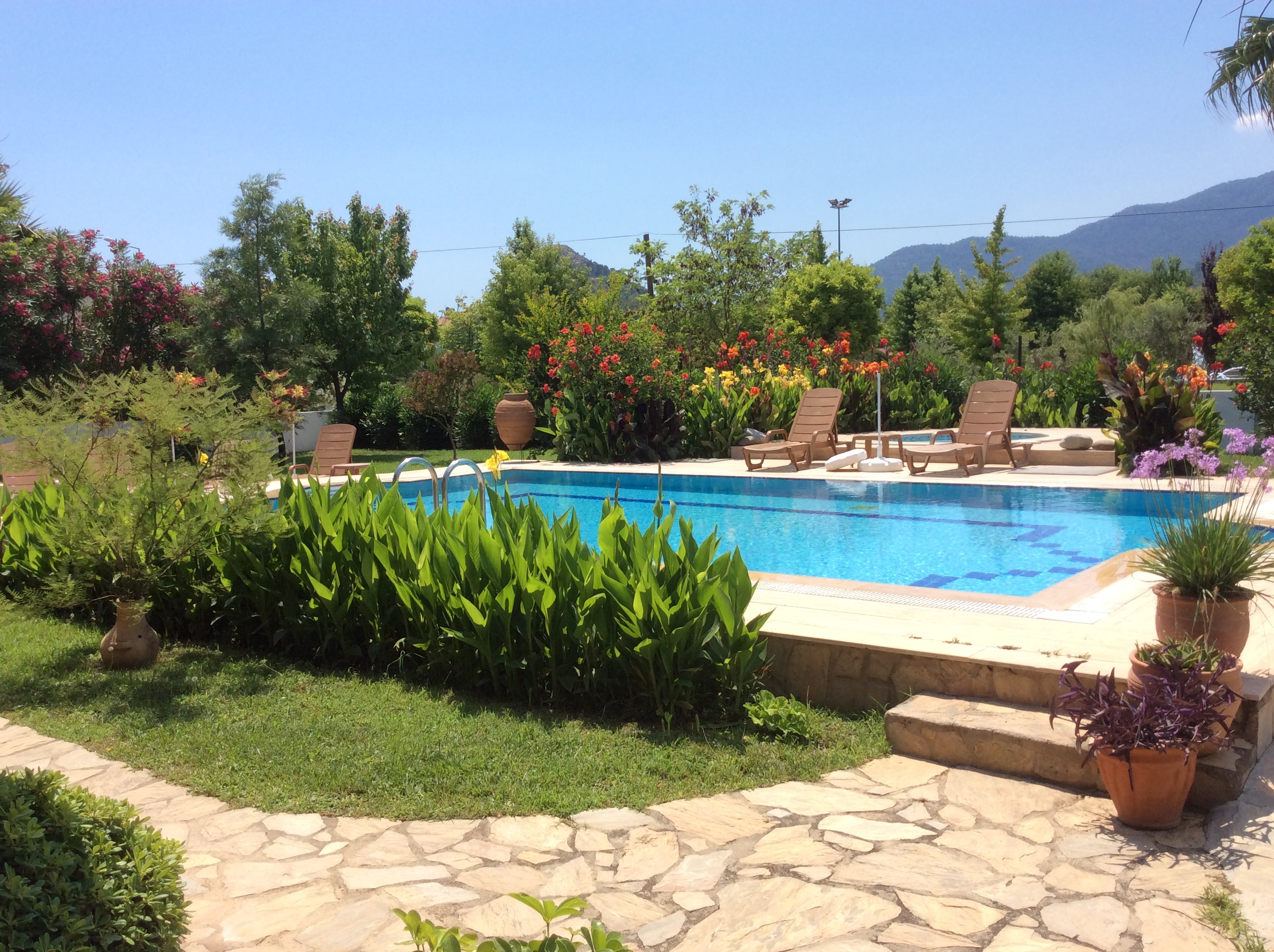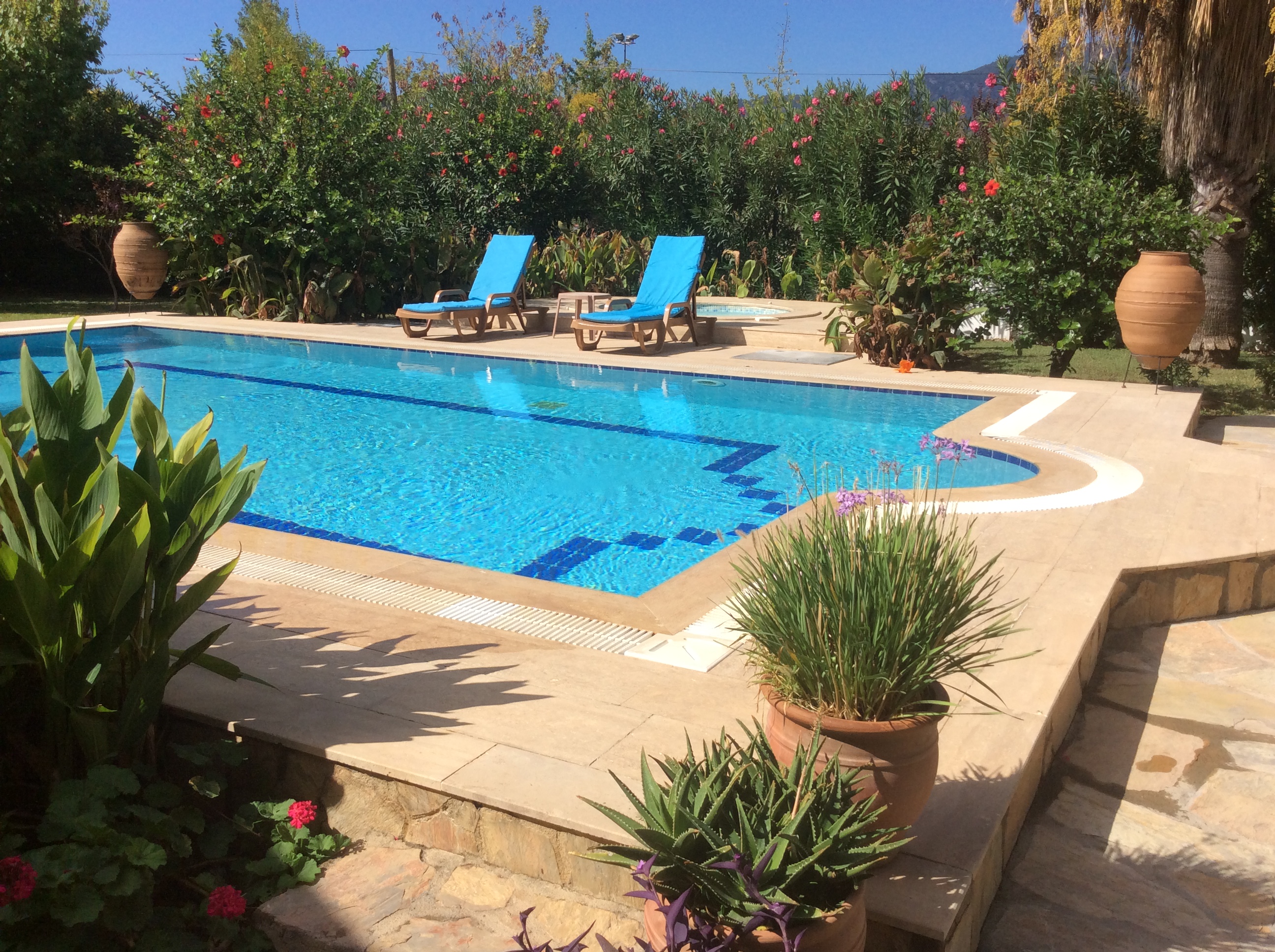 Villa Hatira is a gorgeous 3 bedroom 4 bathroom villa in a large garden with spacious terraces, a large private pool, jacuzzi, outdoor kitchen, wifi and mature gardens. It is ideally positioned opposite a park in the most desirable area of Maras, just 5 minutes’ walk from the centre of Dalyan with all shops, restaurants, bars and riverside walks within easy reach. Your nearest shop and bakery is just 3-4 minutes’ walk away.