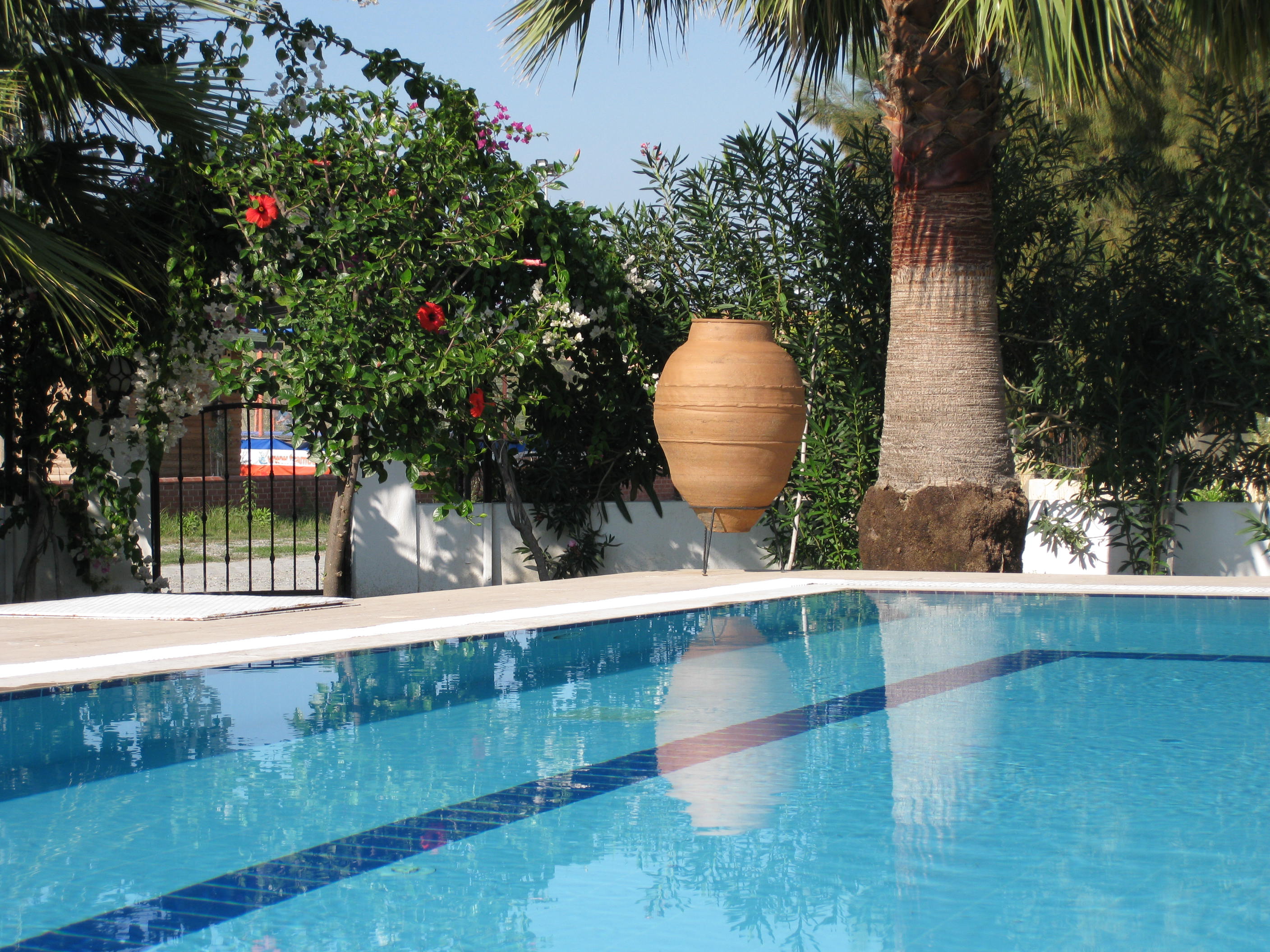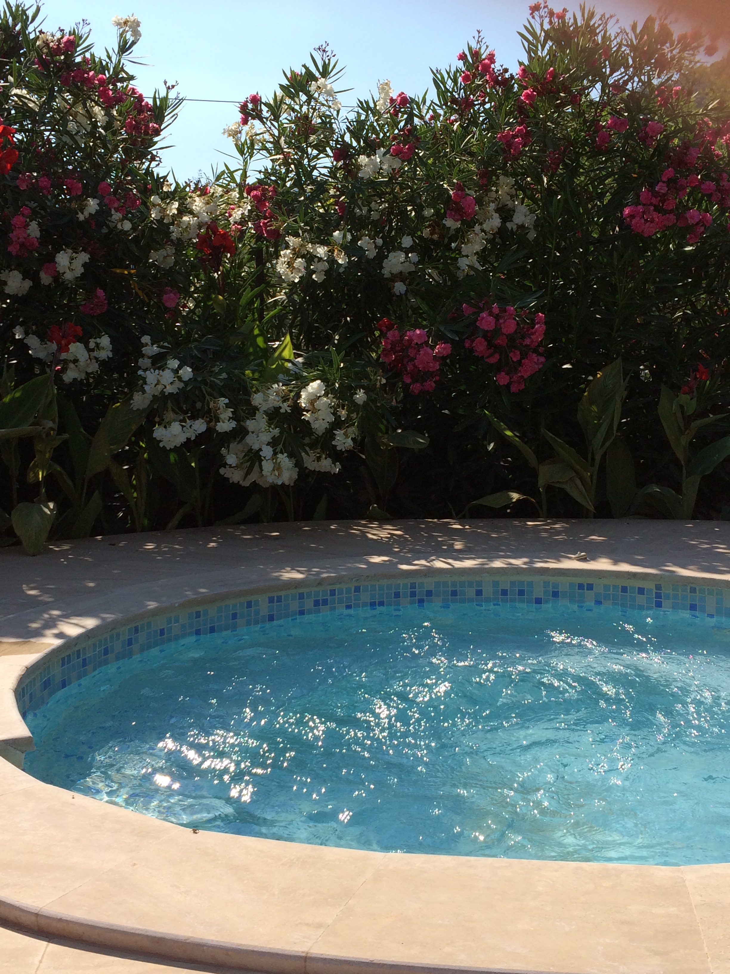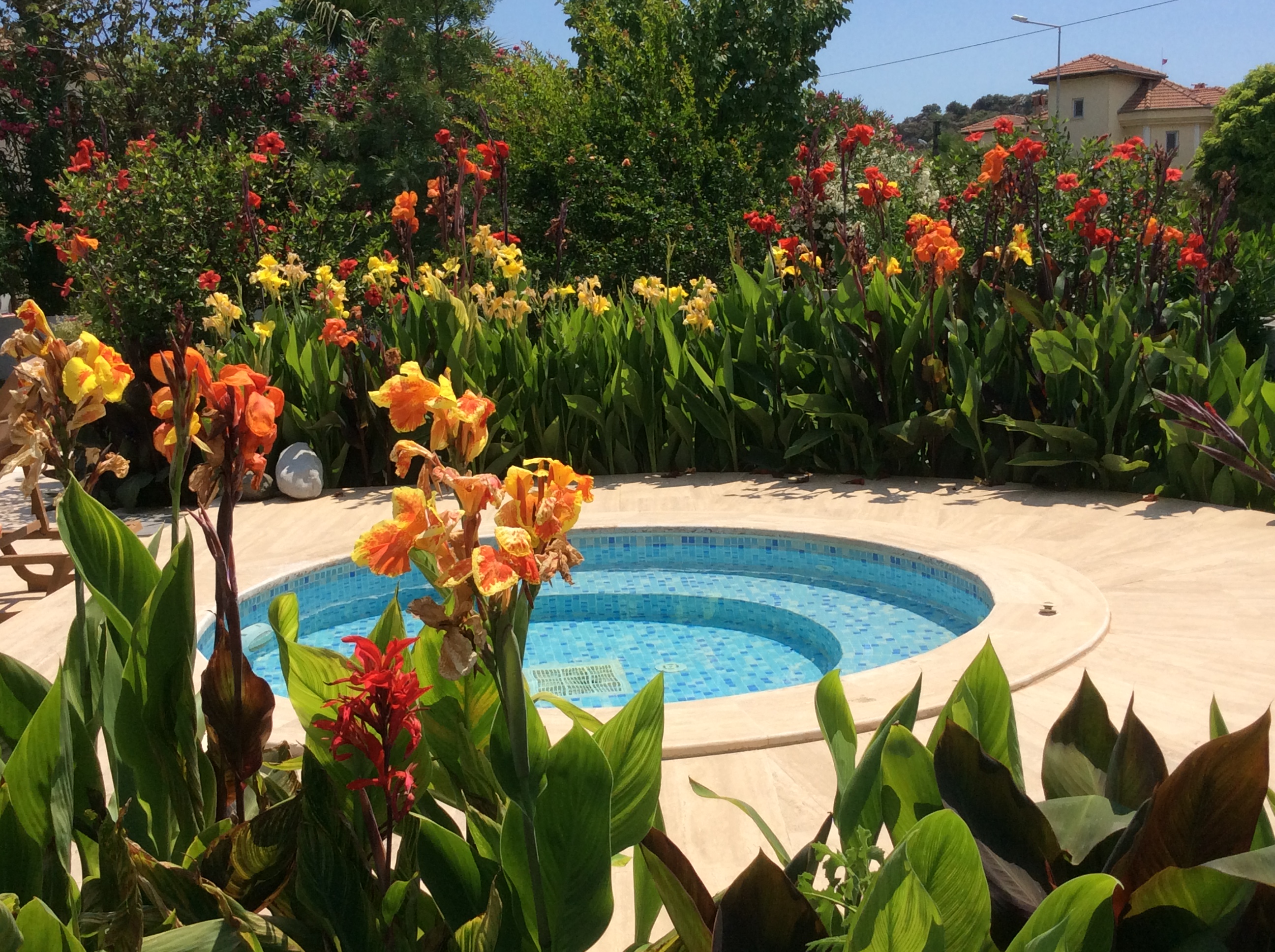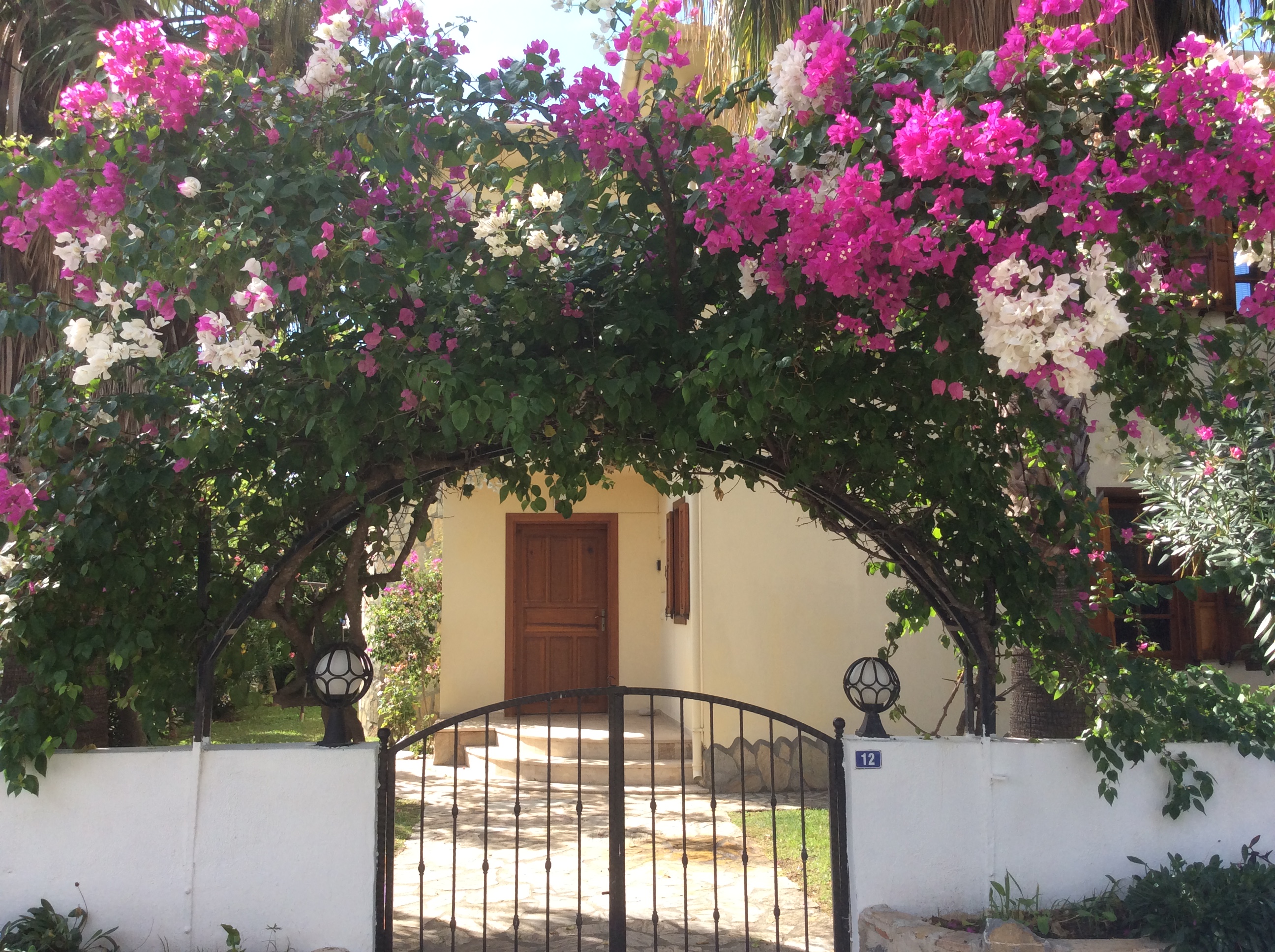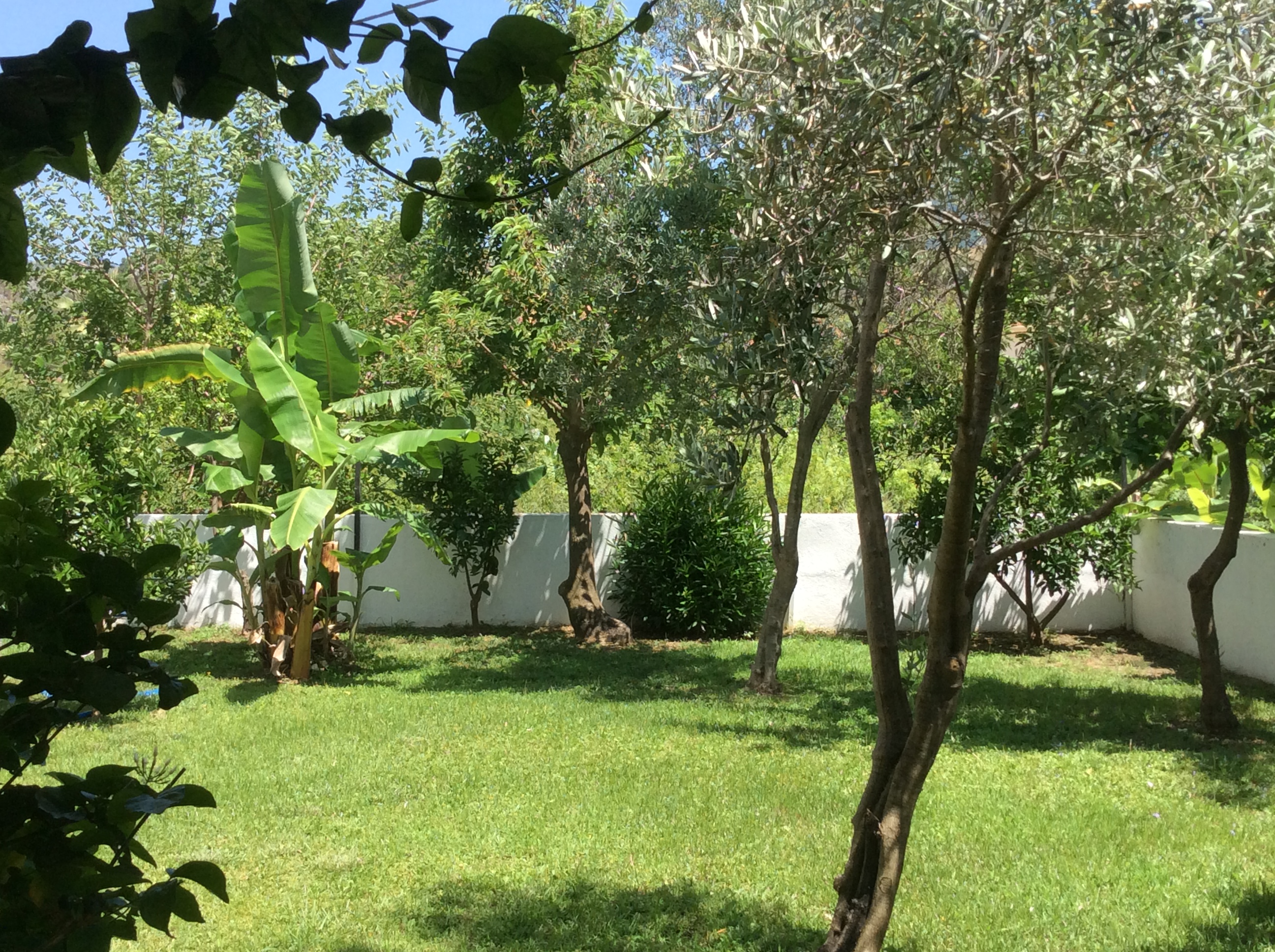The garden at Villa Hatira is approximately 1000 sqm and surrounds the villa. It is bordered by an oleander hedge. There are fruit trees, bougainvillea, jasmine, hibiscus, Mexican orange blossom and other plants. The jacuzzi is surrounded by tall flowering lilies.