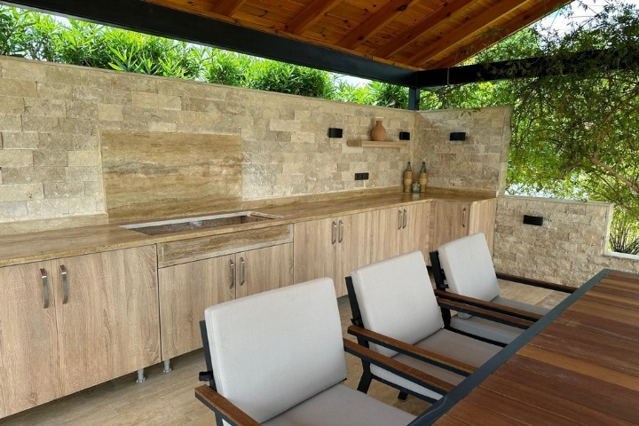 There is a large shaded terrace with cushioned seats ideal for sundowners, snacks and coffee. There is also an outdoor kitchen complete with table and chairs for al fresco dining, a BBQ, sun loungers and parasols. The views face the Lycian Kings tombs that are the symbol of Dalyan. The pool dimensions are approximately 8.5m x 5m x 1.5m deep.